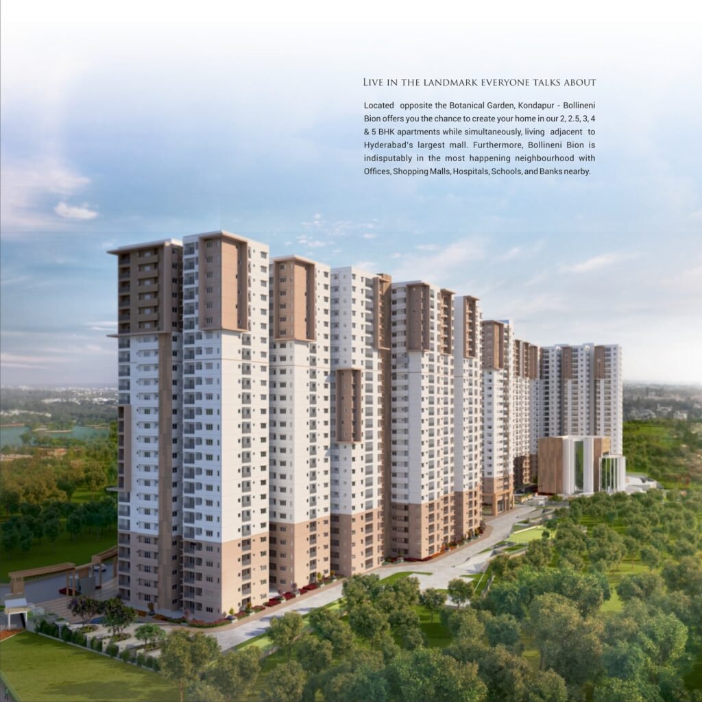 Bollineni Bion is a venture of luxury apartments created to enjoy the perks of modern architecture while being castled by nature. The word Bion literally translates to life, our luxury apartments offer you the chance to rejuvenate your body, soul and mind. The experience entails the purity of living in apartments surrounded by the creator and nurturer of all, i.e., nature. Constructed in the heart of the city, Bollineni Bion stands strong between many landmarks as the most awaited luxury residences with a range of apartments to choose from. 886 Luxury Apartments 2, 2.5, 3, 4 & 5 BHK Apartments